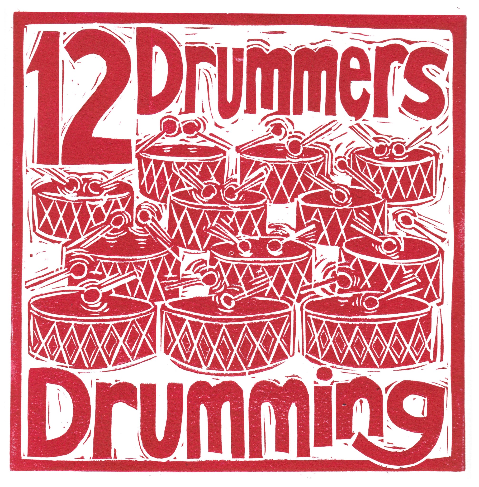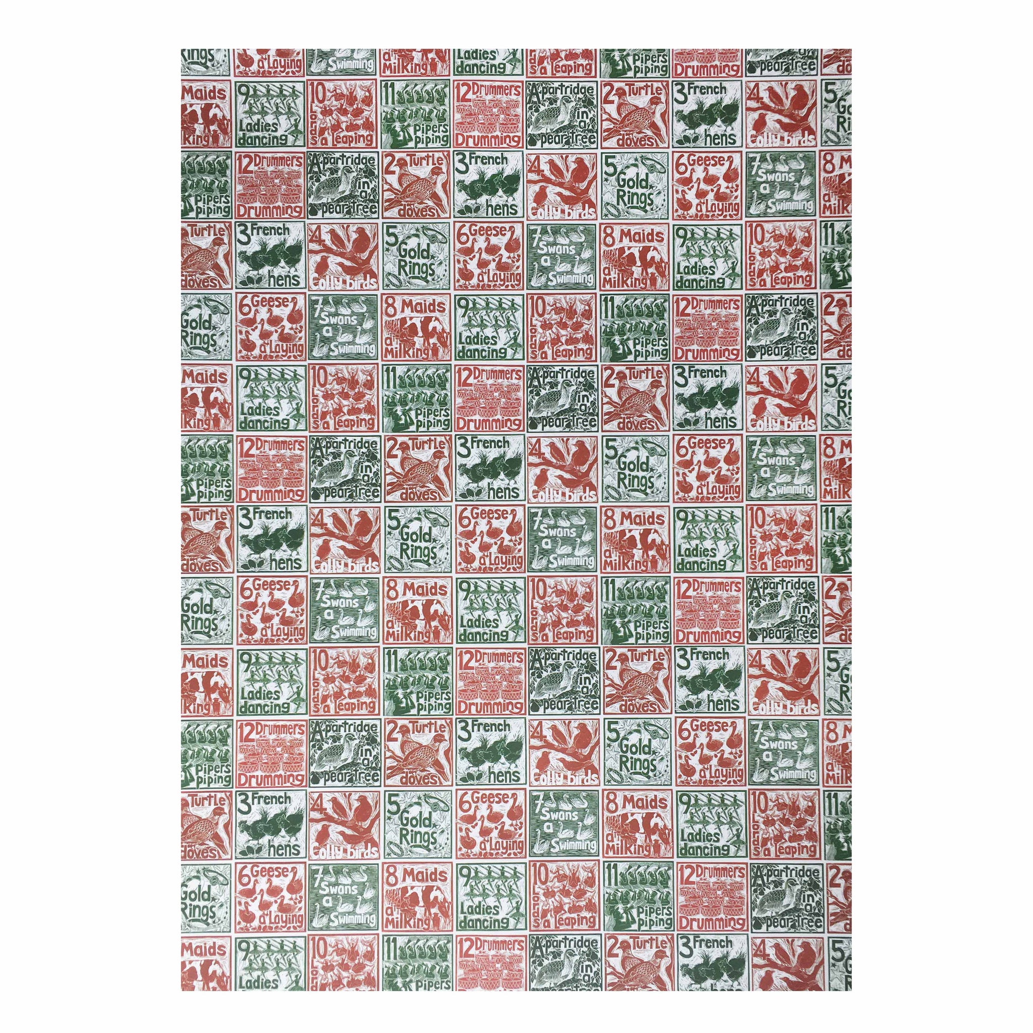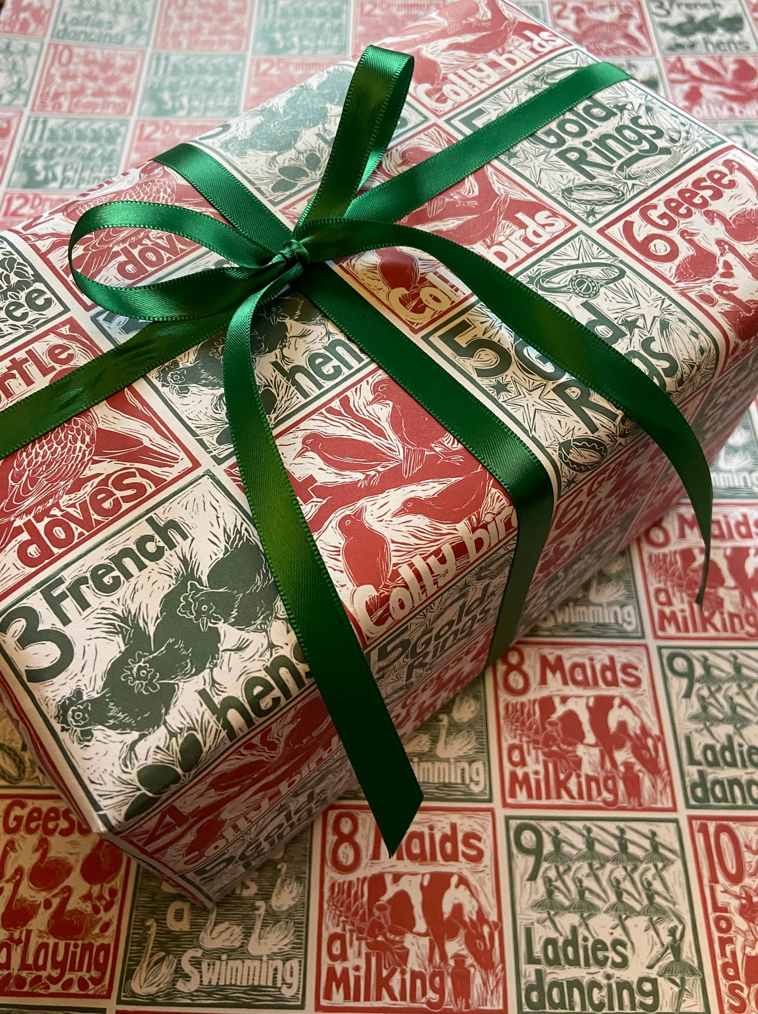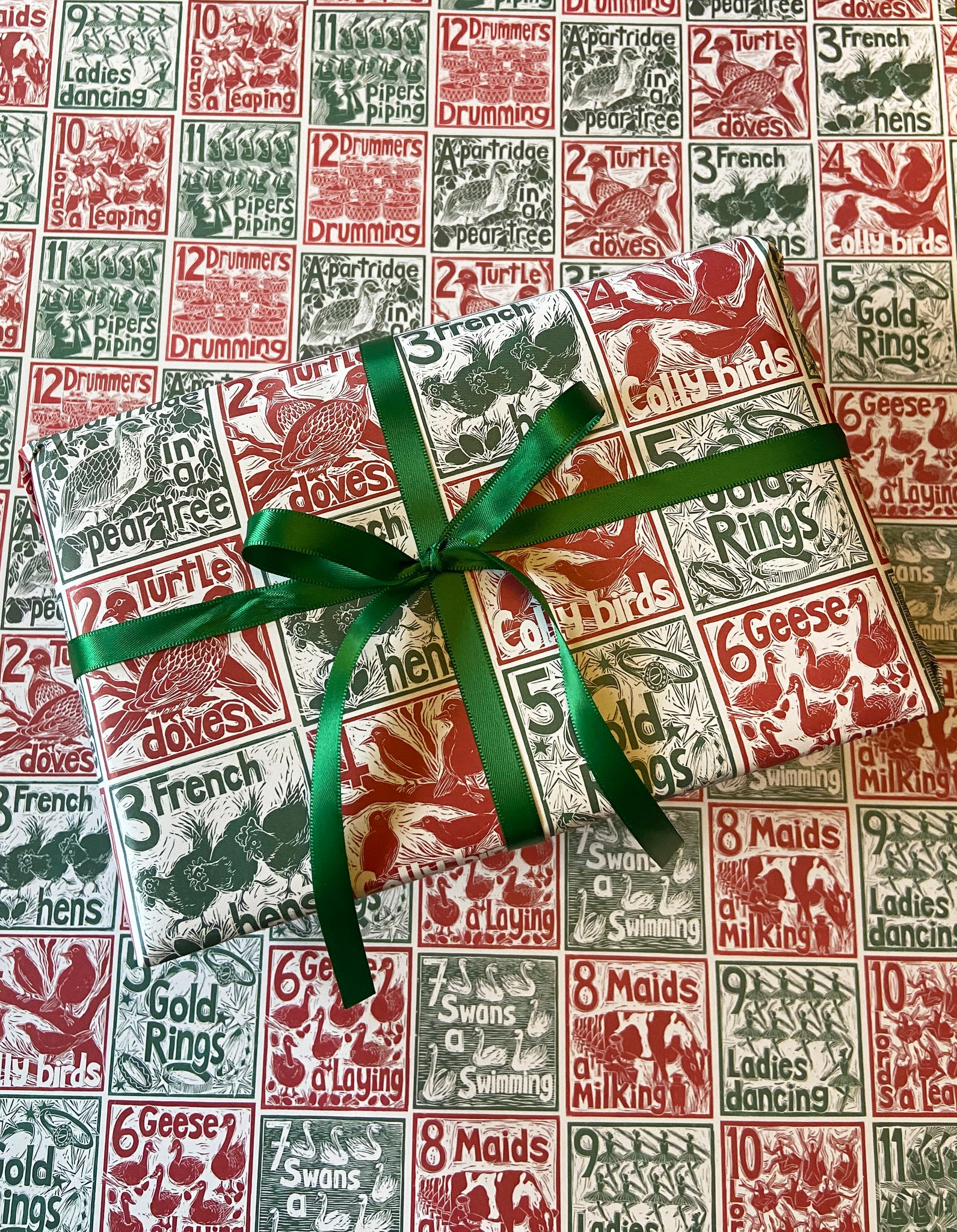 My '12 Days of Christmas' linocuts as a repeating pattern on wrapping paper, printed on quality A2 sized 90gsm paper with a mat finish