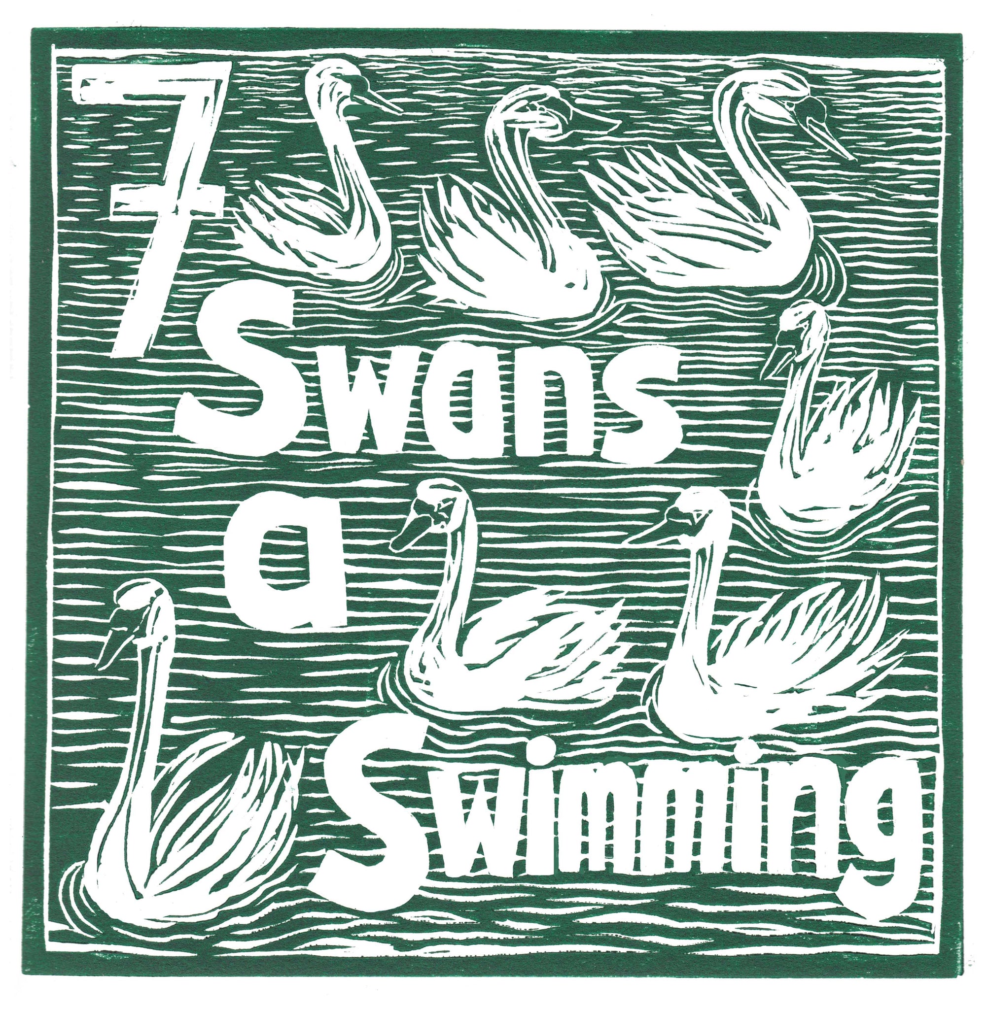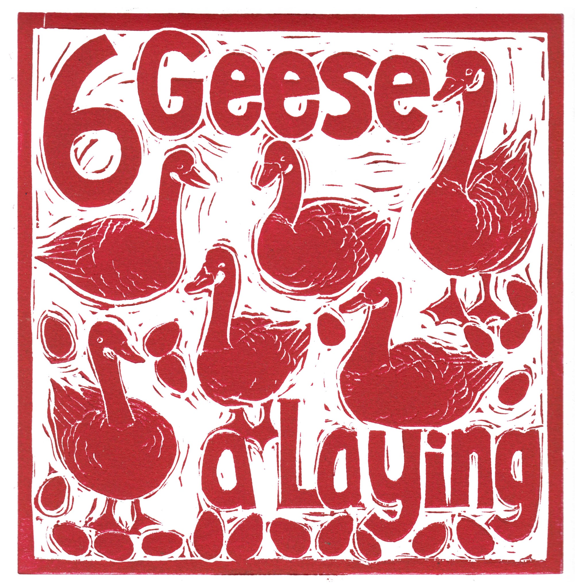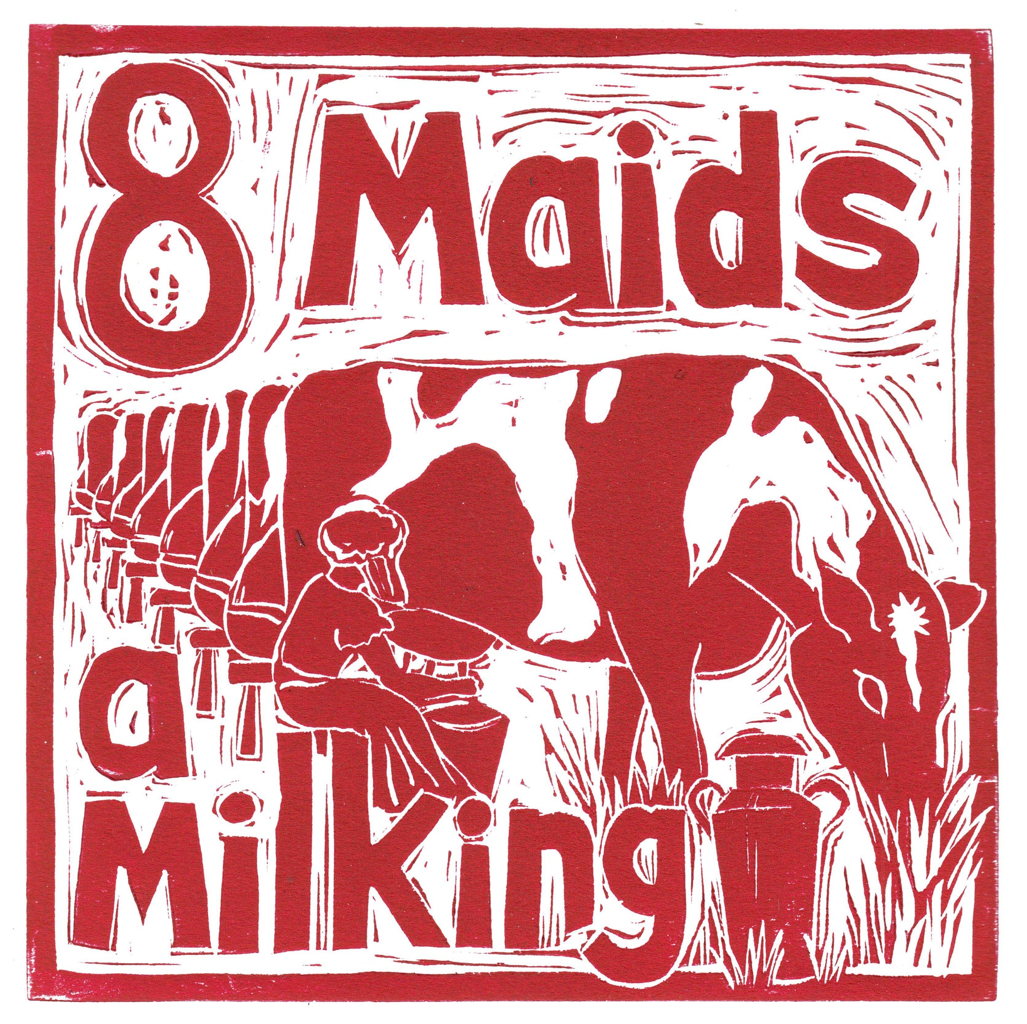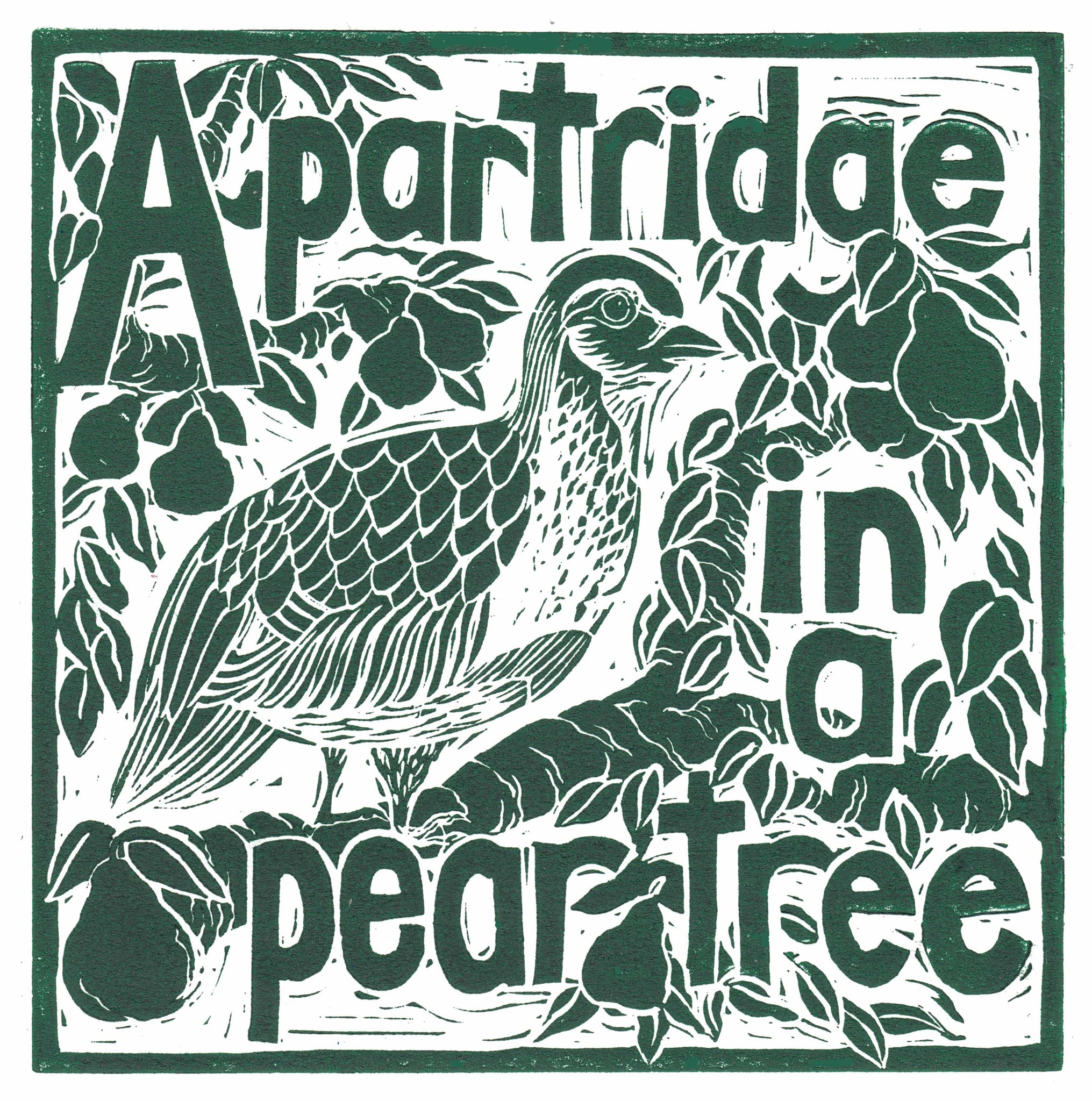 The design depicts my humorous take on the traditional Christmas song where I challenged myself to fit each of the twelve presents given by ‘my true love’ into a square lino cut print. This became increasingly challenging as the presents mounted up. One partridge was simple sitting in it's pear tree, two turtle doves as well, in fact all the way up to eight maids a milking which was the biggest challenge. How to fit all eight maids and their cows in? They must have their cows or they would not be milking - as you can see I came up with a genius solution!