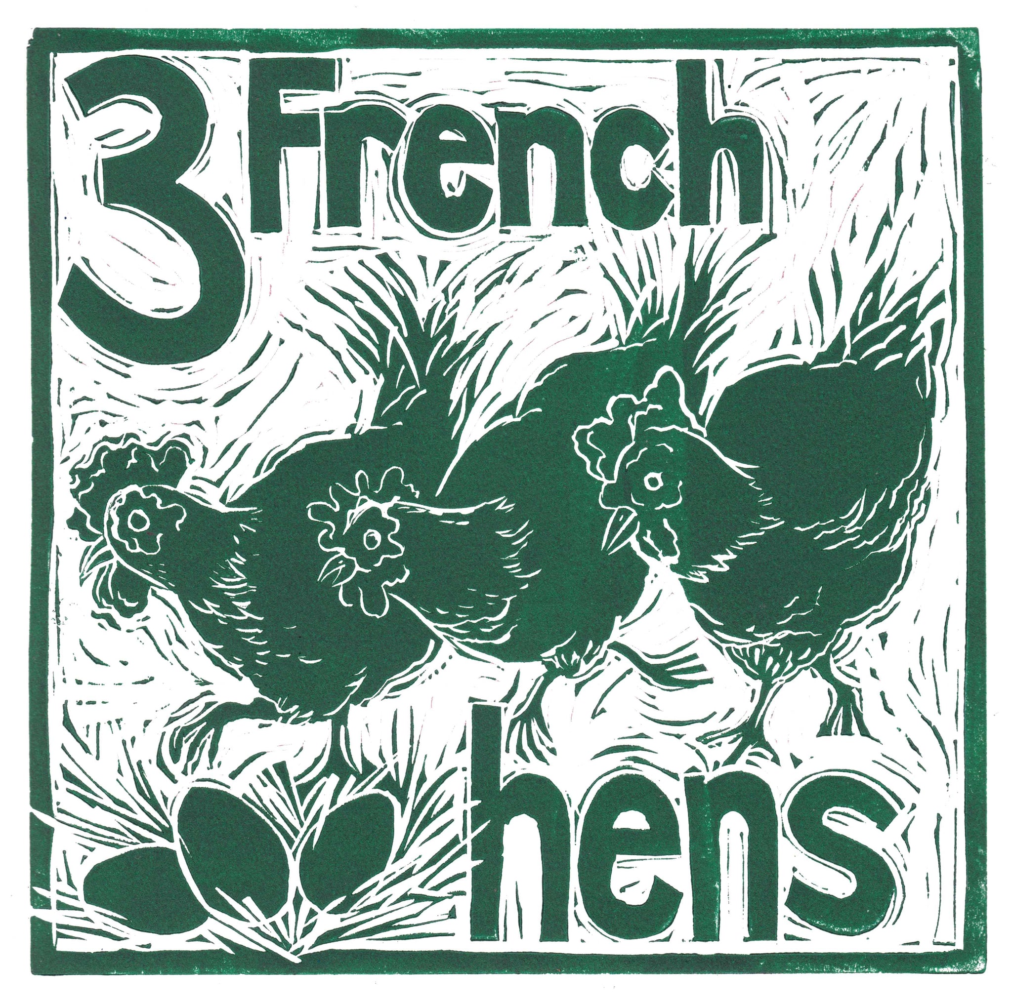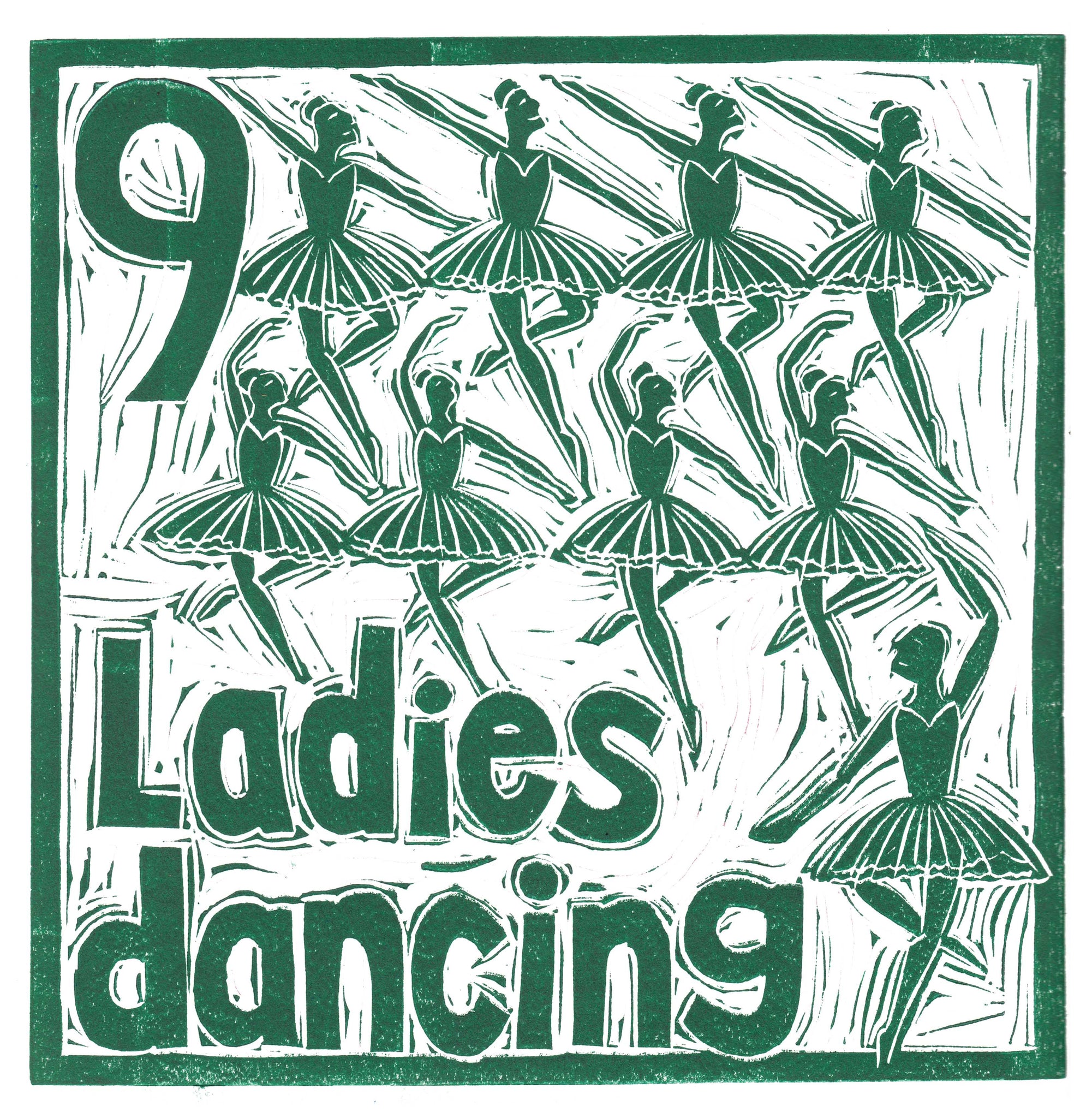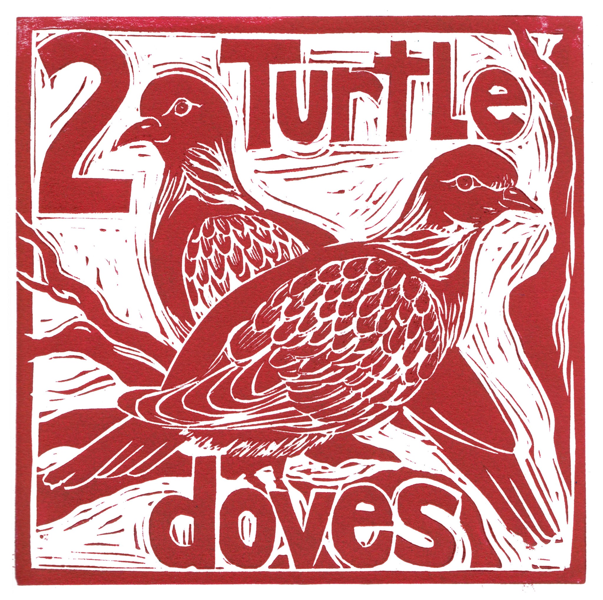 The design depicts my humorous take on the traditional Christmas song where I challenged myself to fit each of the twelve presents given by ‘my true love’ into a square lino cut print. This became increasingly challenging as the presents mounted up. One partridge was simple sitting in it's pear tree, two turtle doves as well, in fact all the way up to eight maids a milking which was the biggest challenge. How to fit all eight maids and their cows in? They must have their cows or they would not be milking - as you can see I came up with a genius solution!