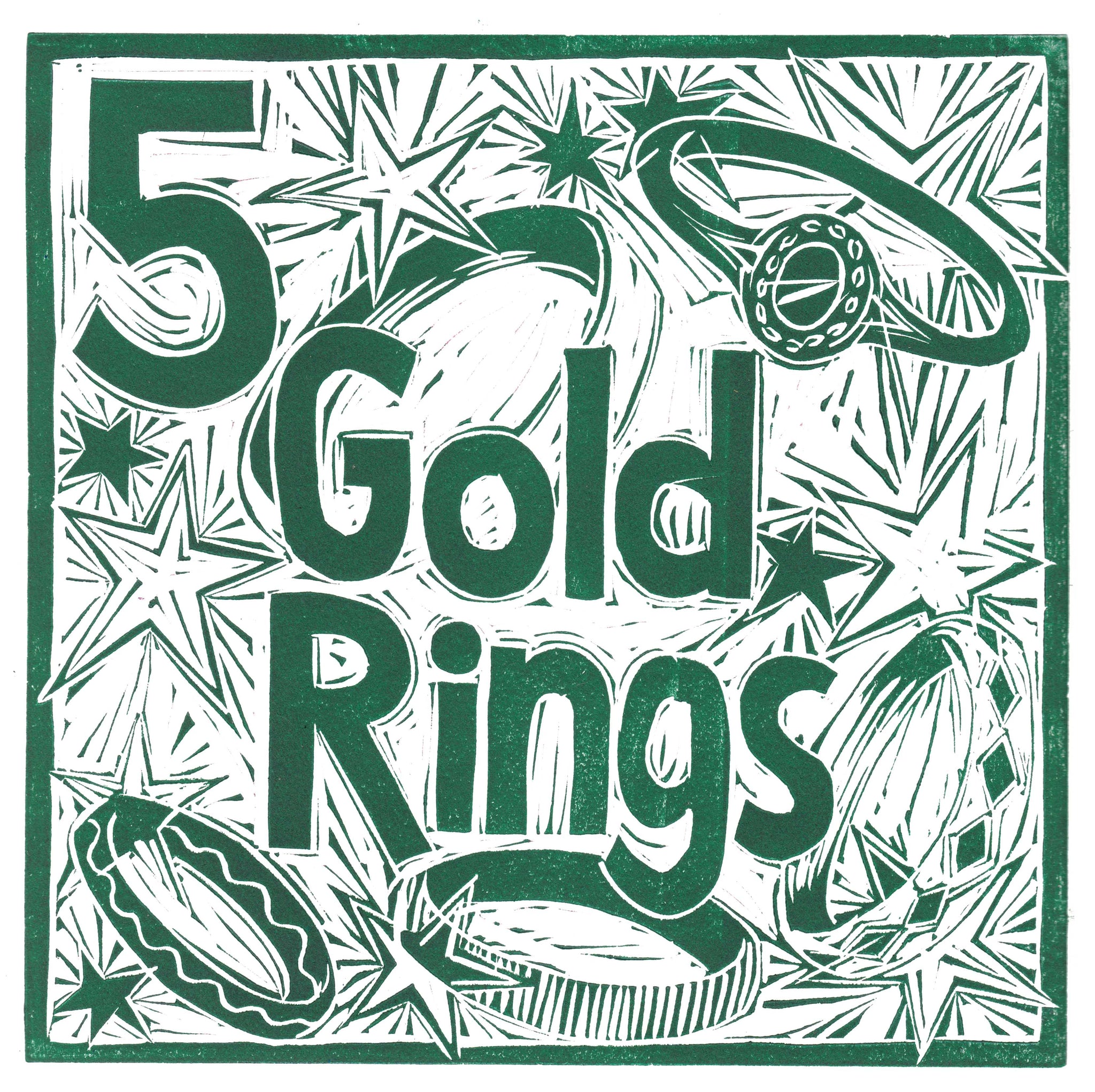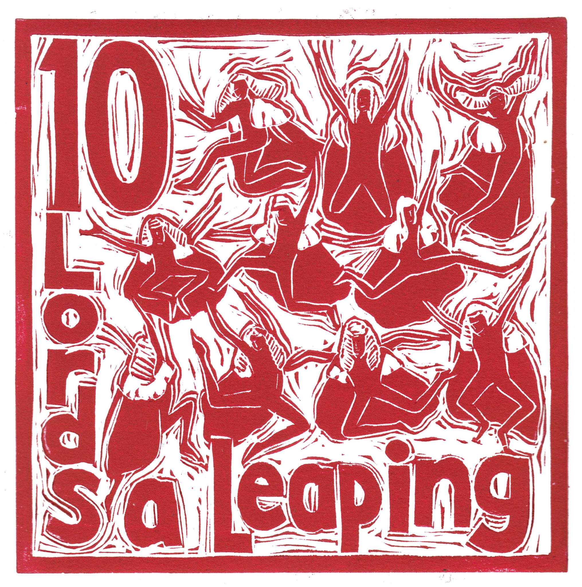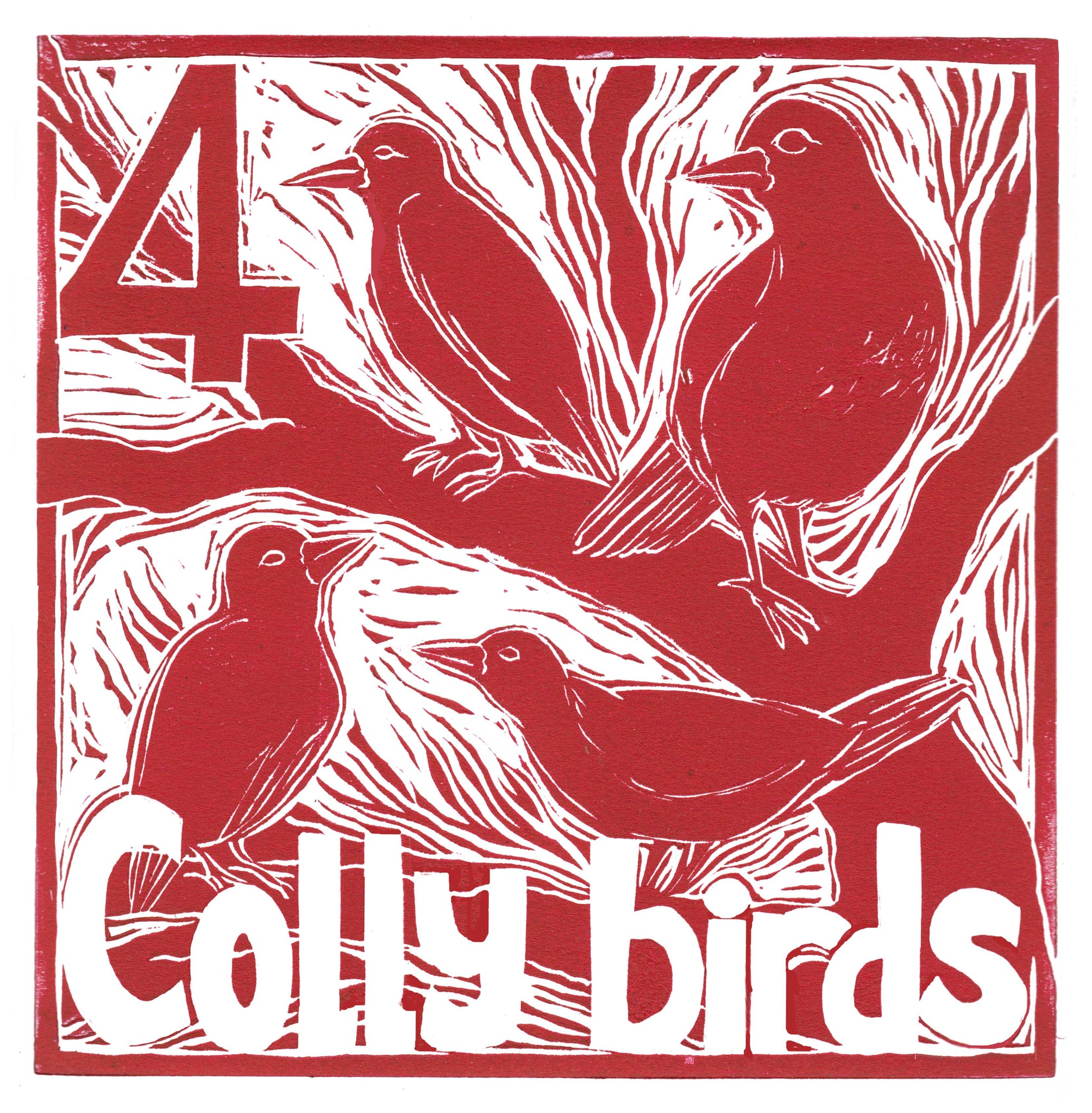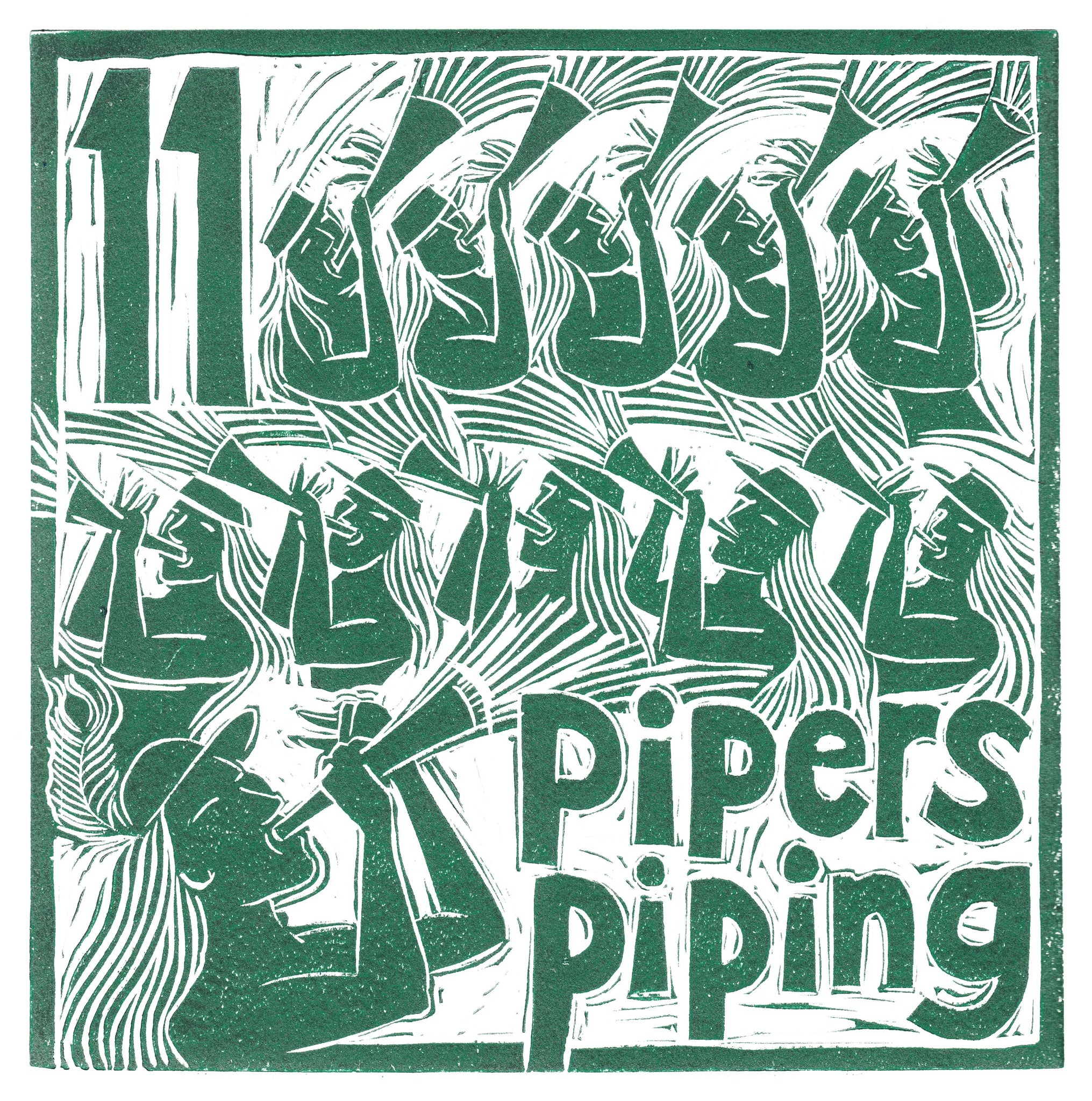 The design depicts my humorous take on the traditional Christmas song where I challenged myself to fit each of the twelve presents given by ‘my true love’ into a square lino cut print. This became increasingly challenging as the presents mounted up. One partridge was simple sitting in it's pear tree, two turtle doves as well, in fact all the way up to eight maids a milking which was the biggest challenge. How to fit all eight maids and their cows in? They must have their cows or they would not be milking - as you can see I came up with a genius solution!